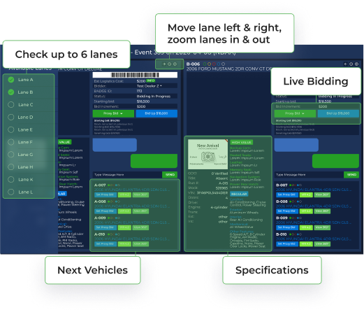 Check up to 6 lanes and have them all displayed on a single screen for multilane participation, rapid bidding, and live streaming. Click control buttons to manipulate lanes at your discretion.